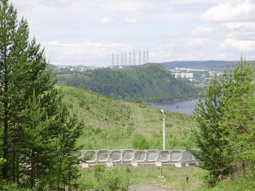 опоры ЛЭП, каменные осыпи. Немного не доходя поселка Ангарский через Ангару