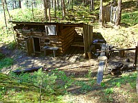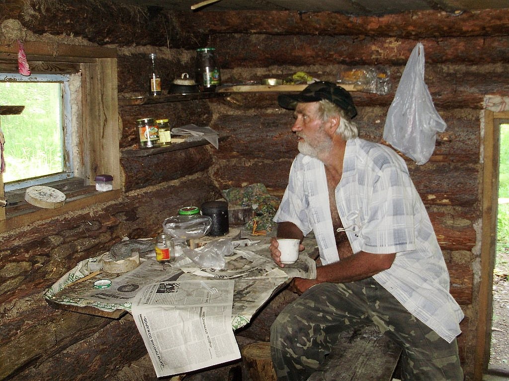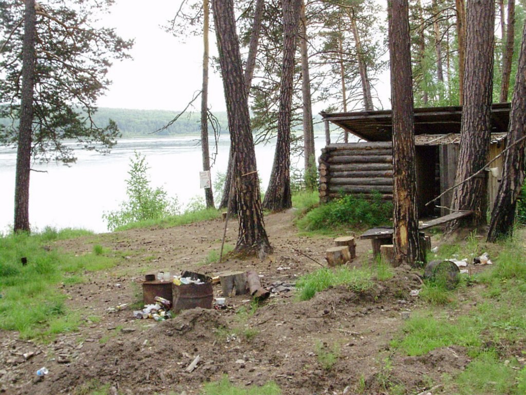 припустился сильней и не давал вылезти из палатки часов до 9. Пасмурно, небо затянуто, тучи тянет с севера. Воды прибыло где-то с 0.5 м и продолжает прибывать. Не спеша позавтракали, начинаем собираться, сворачивать лагерь. Часам к 11 покидаем о.Еловый.(карта О-48-13) Холодно. Идем вдоль ЛБ. Через пару часов прошли речку Едарму и одноименную деревушку в устье.(карта О-48-07) На другой стороне впадает р.Ката. Уже в конце деревни увидели старика на берегу, хотели пристать, но он отвернулся от нас - и мы прошли мимо. Ну чего беспокоить человека, если ему не интересно с тобой общаться. Периодически пробую кидать блесну - ничего.По дороге заходили в пару избушек - посмотреть и сфотографировать. На берегу возле костра подобрали несколько старых картошин - нам пригодится, мы не гордые. Вечером долго искали стоянку, все не было подходящего местечка. То каменюки, то сильно наклонные берега. И комары вылезли после дождя. Выбрались на берег под горкой, когда уже дальше тянуть время было нельзя - начало темнеть. Под палатку пришлось рыть веслом траншею и выравнивать площадку 1х2 м. Только потом на эту площадку поставили палатку. Палатка стоит наклонно, но внутри лежбище ровное. Справились с этой проблемой, приготовили ужин. Когда уже допивали чай, подрулила моторка, которая шла снизу. 3 человека, 2 мужика и женщина, возвращаются в Усть-Илимск. Пригласили их к костру погреться и отдохнуть.Обычные вопросы - кто, откуда и куда и не надо ли какой помощи. Евгений, моего возраста, бывший главный лесничий Усть-Илимска, сейчас на пенсии. Хорошо выпимши. Здоровый, грузный дядька с бородой. Захотелось ему посидеть у костра с хорошими людьми … и еще добавить. Достал бутылку, предлагал нам, но мы отказались. Достали мы свое сало, хлеб - ну надо же народу чем-то закусить. Поставили еще котелок на костер - чайком гостей угостить. Понравилось им сало украинское с чесночком, которое я еще перед походом самолично засолил. Ольга насыпала Ирине горсть конфет к чаю. Комары немного достают, но терпимо - отмахиваемся. Проболтали, точнее прослушали пьяную болтовню Евгения, почти до 23 часов. Его напарники начали уже волноваться и скандалить, собирались пешком дальше идти. С трудом уговорили Евгения плыть дальше - лодка то его. Погрузили Евгения в лодку - с трудом переставляет ноги, но еще пока соображает. Ольга жаловалась, что он уже 5-й день с ними квасит - надоел. Ну а нам остается только улыбаться сочувственно. Угостили нас двумя кусками соленой щуки, двумя буханками хлеба и бутылкой молока. Спасибо! Завтра они уже будут дома, а у нас еще дорога дальняя. Попрощались, оттолкнул лодку от берега. Мотор у них хороший, японский - завелся с пол-оборота. Уплыли гости - мы помахали ручкой на прощание, убрали посуду под тент и забрались в палатку. Отбой. За день прошли 39 км.