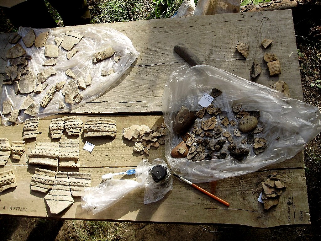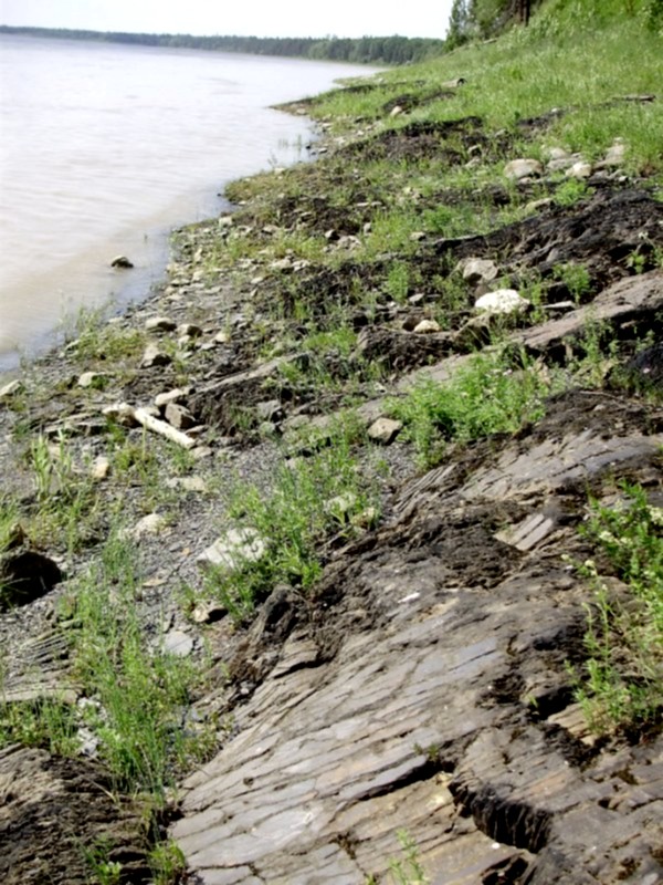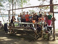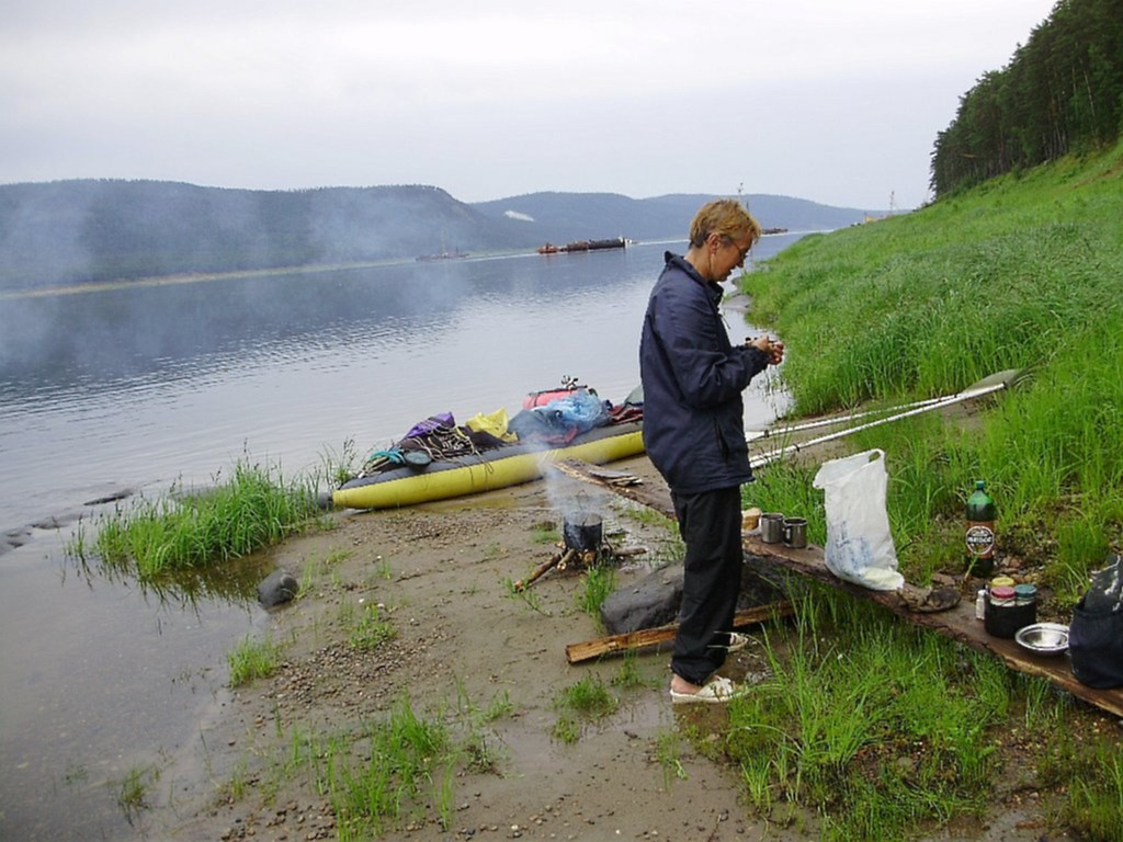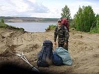 Сергей ведет нас на раскопки, показывает находки - они разложены на столе и промаркированы. Есть находки I века до н.э. Люди селились на Ангаре несколько тысяч лет назад. Показывает места, где были землянки сталинских времен. Возвращаемся к палаткам. Ребята усаживают нас за стол, угощают гороховым супом с тушенкой и кофе со сгущенкой. Делаем несколько снимков, оставляем им тюбик мази от комаров. Очень много мошкары - Ирину прям заедают, а мне ничего. Сергей показывает простейшую дымовуху от мошки - консервная банка с ручкой из проволочки, в боках ножом сделана куча дырочек для воздуха, заправляется смесью угольков из костра и мелко раздавленного сухого гриба-трутовика со старой березы. Дымит хорошо и сибиряки его давно используют. Нам подобную конструкцию показывали рыбаки в Карелии на Топозере. Сфотографировали ребят, обменялись адресами в Интернете, попрощались и пошли дальше. 20-30 Прошли с.Стрелка. Последние фото р. Ангара. Наверху по карте Усть-Ангарск, но домов с воды не видно. На правом берегу встречаем отвал - прямо с крутого берега все сыпят вниз. На отвале стоит табличка со знаком "Осторожно РАДИОАКТИВНОСТЬ". Странно…все прямо в Ангару. Слева показался Енисей. Начали искать стоянку, правый берег похож на булыжную мостовую из здоровых булыжников. Прошли еще км 6, прежде чем нашли стоянку за Усть-Тунгусскими островами на ПБ. ( Карта 0-46-15) Место приличное, но много мошки. Заедает. Разгрузились - первым делом костер, и чтоб дымил побольше, разгонял мошку. Потом палатка, ужин. Выпили по 50гр. за успешное прохождение Ангары. За 25 дней выпили всего полбутылки "Перцовой" и прошли почти 850 км. Сама Ангара по лоции, по фарватеру 815км, но мы еще гуляли туда-сюда между берегами, островами - вот и набралось. Что намерял по своим распечаткам - то и пишу. А при ширине реки 1-3 км оно быстро набегает, несколько раз в день пересечешь ее - вот и накапает. К 24-м часам все работы сделаны. Навалил в костер еще бревен, чтоб дымили всю ночь - рядом кущи и болото, тропы какие-то. После всего можно и спать укладываться. За день прошли 42 км.