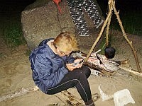 более-менее сухую, развожу костер. Кипятим чай.По кружке пива. Немного
