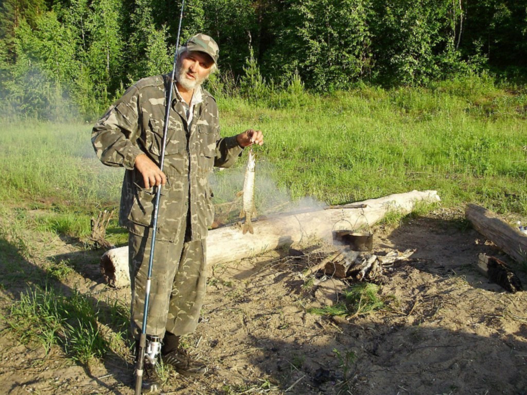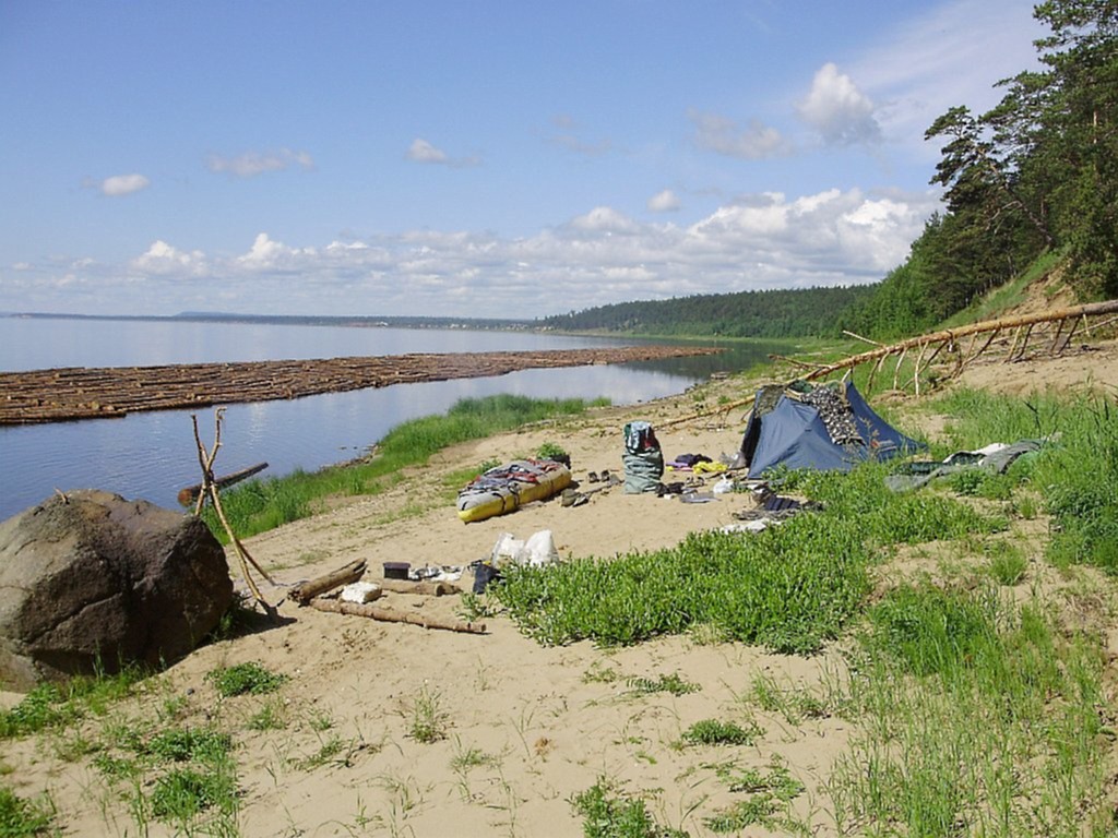 Над рекой еще стоит туман. Тишина. Катеров, буксиров сегодня нет - суббота. Достали сетку, которую поставили вчера вечером. Набилось много травы и попалось 2 шт. ельца. Течение тут быстрое и не совсем удачное место для сетки. Но спасибо и за то.На завтрак жарим первую рыбу! Вышли уже после 11. Жарко, солнце припекает - пытаемся загорать. Попробовали окунуться - вода холодная, но на солнце как бы и терпимо. Уже после перекуса прошли мимо острова Басковой.(карта О-47-12)По левому берегу натыканы таблички - "Запретная Зона КП21". Лагерь, вышка - заключенные вяжут плоты. Чуть дальше 2 башенных подъемных крана, горы леса, баржа. Видимо тут заготавливают лес и отправляют его плотами и баржами дальше. Шли до 20 часов. Возле деревни Аксёново вышли на берег. Деревни уже нет, все дома снесены. скоро тут будет зона затопления. Мы посовещались, и я решил - дальше не идти, а стать прямо тут и завтра сделать дневку. Выгрузились. Палатка, дрова, костер, ужин. Напротив через протоку на о. Чирчана бегает собака. Сначала нам погавкала, потом замолчала. Бегает по берегу и гоняет уток и чаек - прыгает за ними прямо в воду.Забрались в палатку - и спать. За день прошли 41 км.