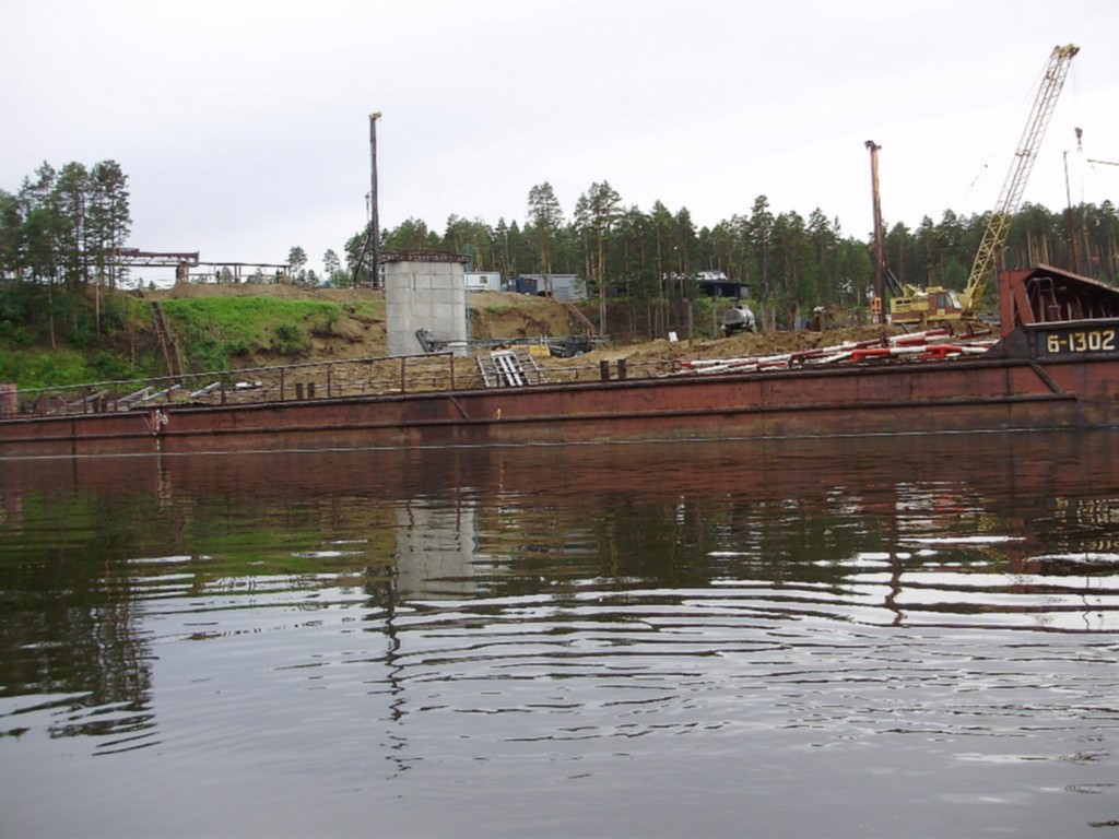 строится большой мост. Куча техники. Одна опора уже есть - на левом берегу.